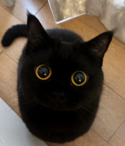 The little black cat is really cute.